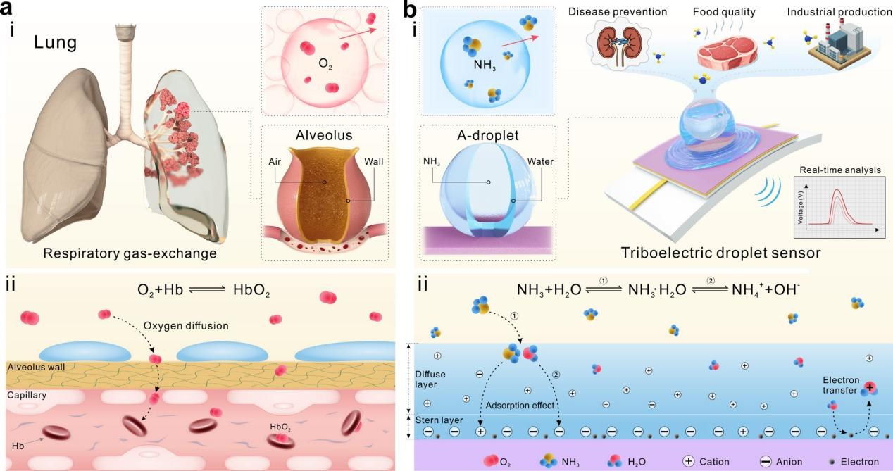 To address this challenge, the research team drew inspiration from the structure of pulmonary alveoli and their gas exchange mechanism to develop a hollow droplet (A-droplet)–driven gas sensor. The device achieves rapid response through instantaneous electron transfer at the liquid–solid interface, without relying on gas adsorption–desorption reactions. This hydroelectric sensing mechanism enables an ultrafast response time, surpassing that of mainstream ammonia sensors.
