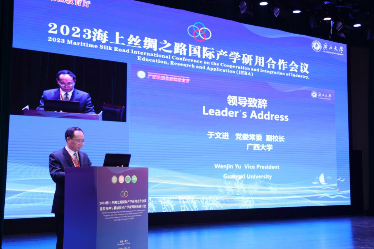 From December 2-3, 2023 Maritime Silk Road International Conference on the Cooperation and Integration of lndustry, Education, Research and Application (IERA)---International Symposium on Genetic Breeding and Cultivation Technology for Integration of lERA was held in Guangxi University. The conference was co-sponsored by the Education Department of Guangxi Zhuang Autonomous Region and Guangxi University, and co-organized by the School of Agriculture, the School of Life Science and Technology of Guangxi University and the State Key Laboratory for Conservation and Utilization of Subtropical Agro- Bioresources. Wu Jinchang, Deputy Director-General of the Education Department of Guangxi Zhuang Autonomous Region, and Yu Wenjin, member of the Standing Committee of CPC Guangxi University Committee and Vice President of GXU attended the opening ceremony and made speeches.