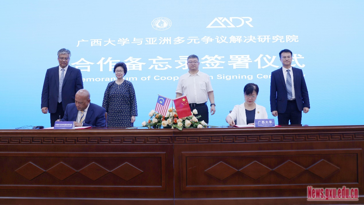 At the conference, GXU and AIADR also held a signing ceremony of a memorandum of understanding (MOU) and an appointment ceremony for visiting professors. In the presence of Tian and Lim, the heads of the International Cooperation and Exchange Department of GXU and AIADR jointly signed the MOU. The two sides will engage in comprehensive collaboration in international arbitration research, personnel training, and curriculum development. Tian also presented appointment letters for visiting professors to four overseas experts: Mary Lim Thiam Suan, Sundra Rajoo, Choong Yeow Choy, and Chen Xiuting.
