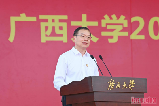 Hiệu trưởng Hàn Lâm Hải có bài phát biểu “Dám làm và làm đúng cách, phấn đấu thêm hồng sắc màu tuổi trẻ”, chào mừng và chúc mừng các tân sinh viên đã gia nhập vào đại gia đình Trường Đại học Quảng Tây, đồng thời bày tỏ sự kính trọng và biết ơn đối với các bậc phụ huynh, thầy cô đã tận tâm bồi dưỡng tân sinh viên. Ông đã giới thiệu về lịch sử phát triển của Đại học Quảng Tây trong hơn 90 năm qua, nhắc lại mục đích thành lập nhà trường “bảo vệ Trung Quốc, phát triển Quảng Tây” của Hiệu trưởng đầu tiên Mã Quân Vũ và nội hàm phong phú và ý nghĩa sâu rộng của phương châm “cần cù, chân thành” của trường. Hiệu trưởng Hàn Lâm Hải chỉ ra rằng, tuổi trẻ ngày nay sống trong thời đại hưng thịnh, đúng là lúc để phấn đấu vươn lên. Thời kỳ đại học là giai đoạn then chốt cho sự trưởng thành của sinh viên, hy vọng các bạn sinh viên có thể nắm bắt tốt các cơ hội để trở thành nhân tài, ghi nhớ sứ mệnh, phấn đấu thêm hồng sắc màu tuổi trẻ, bắt đầu một cuộc sống học tập thật rực rỡ tại Đại Học Quảng Tây. Ông kêu gọi các tân sinh viên quyết tâm phục vụ đất nước, phấn đấu trở thành những người theo đuổi ước mơ vĩ đại, cầm vững gậy tiếp sức của thời đại, kiên định lý tưởng và niềm tin, mang trong lòng “mối quan tâm của nhà nước”, gắn chặt chí hướng cá nhân với vận mệnh đất nước và dân tộc, phấn đấu trở thành những con người mới của thời đại có thể gánh vác nhiệm vụ quan trọng phục hưng dân tộc; trau dồi những bản lĩnh vững chắc và vững vàng, trở thành người thực hành làm việc đến nơi đến chốn, kiên trì và sáng tạo, nỗ lực bền bỉ, nghiêm túc làm việc, kiên trì làm việc đến nơi đến chốn với tinh thần theo đuổi chân lý làm việc thực chất và thái độ đã tốt lại phải tốt hơn, đối mặt trực diện và vượt qua những khó khăn, thách thức trên con đường học tập, mở ra tương lai rực rỡ thuộc về chính mình; chủ động ứng phó với những thách thức của thời đại, dũng cảm làm người tiên phong đổi mới và sáng tạo, khơi dậy tối đa nhiệt huyết sáng tạo và tiềm năng sáng tạo, dũng cảm đi đầu, cách cố đỉnh tân, dùng trí tuệ của tuổi trẻ thúc đẩy tiến bộ xã hội và tạo ra một tương lai tươi đẹp.