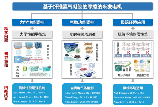 ໃນຊຸມປີມໍ່ໆມານີ້, ພາຍໃຕ້ການນໍາພາຂອງ Nie Shuangxi, ກຸ່ມດັ່ງກ່າວໄດ້ດໍາເນີນການຄົ້ນຄ້ວາພື້ນຖານຢ່າງເປັນລະບົບກ່ຽວກັບການກໍ່ສ້າງແລະກ້າວຫນ້າທາງດ້ານອຸປະກອນທີ່ເປັນປະໂຫຍດຂອງເຈ້ຍ, ແລະວາງທິດທາງການຄົ້ນຄວ້າຂອງ "Frictional Nanogenerator Based on Cellulose Aerogel", ເຊິ່ງແກ້ໄຂບັນຫາຄໍຂວດຂອງຄວາມທົນທານຕໍ່ດິນຟ້າອາກາດທີ່ບໍ່ດີໃນສະພາບແວດລ້ອມທີ່ໂຫດຮ້າຍແລະຍາກທີ່ຈະປັບປຸງຄຸນສົມບັດກົນຈັກຂອງ ແຮງສຽດສີ ແບບດັ້ງເດີມ. ໂດຍຜ່ານຍຸດທະສາດຂອງລະບຽບໂຄງສ້າງການລວບລວມ cellulose airgel ແລະວິສະວະກໍາການໂຕ້ຕອບຂອງໂຄງສ້າງໄມ້ທີ່ສົມບູນ, ພວກເຂົາເຈົ້າໄດ້ວິເຄາະຄວາມສໍາພັນລະຫວ່າງ ແຮງລະຫວ່າງໂມເລກຸນ cellulose ແລະຄຸນສົມບັດກົນຈັກ, ຊີ້ແຈງ ກົນໄກການກະຈາຍພະລັງງານຂອງ cellulose triboelectric aerogels, ແລະແຕກແຍກໂດຍຜ່ານບັນຫາທີ່ ນ້ຳໜັກເບົາແລະຄວາມແຂງສູງຂອງອຸປະກອນການ. ໂດຍຜ່ານຍຸດທະສາດຂອງວິສະວະກໍາການໂຕ້ຕອບ ທີ່ບໍ່ເປັນເນື້ອດຽວກັນມີ ຮູຕາມລຳສ ດັບຊັ້ນ ແລະປະກອບຕົນເອງ, ພວກເຂົາເຈົ້າສົບຜົນສໍາເລັດ endowed cellulose aerogels ມີຫນ້າທີ່ລະອຽດອ່ອນຂອງອາຍແກັສ,ຮັບຮູ້ສະຖານທີ່ ໃນເວລາຈິງຕິດຕາມກວດກາອາຍແກັສເຊັ່ນ: ammonia ແລະ ອາຍນ້ໍາ. ໂດຍຜ່ານການອອກແບບໂມເລກຸນຂອງ cellulose, ວິສະວະກໍາ cell wall , ການຕິດພັນຂອງ ໂມເລກຸນ ແລະຍຸດທະສາດອື່ນໆ, ການຕ້ານການແປວໄຟຄວາມຫມັ້ນຄົງຂອງຄວາມຮ້ອນແລະການຕໍ່ຕ້ານນ້ໍາຂອງ cellulose triboelectric aerogels ໄດ້ຖືກປັບປຸງຢ່າງຫຼວງຫຼາຍ, ຮັບຮູ້ ການນໍາໃຊ້ປະສິດທິພາບໃນສະພາບແວດລ້ອມທີ່ຮ້າຍໄປເຊັ່ນ: ອຸນຫະພູມສູງ, ຄວາມຊຸ່ມຊື່ນສູງ, ແສງສະຫວ່າງທີ່ເຂັ້ມແຂງ, ອຸນຫະພູມຕ່ໍາແລະອາຍແກັສພິດຂອງອຸປະກອນການທໍາລາຍຄວາມລົ້ມເຫຼວຂອງການປະຕິບັດ.
