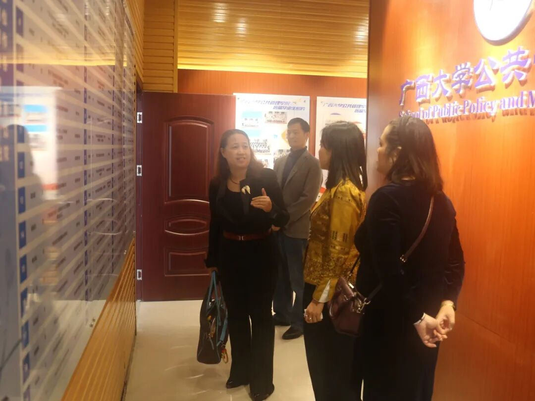 ໃນຕອນເຊົ້າຂອງວັນທີ 20 ທັນວາ, ຄະນະຜູ້ແທນຈາກມະຫາວິທະຍາໄລກາລະສິນ, ປະເທດໄທ ໄດ້ໄປຢ້ຽມຢາມໂຮງຮຽນນະໂຍບາຍສາທາລະນະ ແລະ ການຄຸ້ມຄອງ ມະຫາວິທະຍາໄລກວາງຊີ ເພື່ອແລກປ່ຽນປະສົບການ. ຄະນະຜູ້ແທນນຳໂດຍ ທ່ານນາງ ພິມລິກິດ ແກ້ວຫານາມ, ຜູ້ອຳນວຍການສະຖາບັນຄົ້ນຄວ້າ ແລະ ພັດທະນາ ມະຫາວິທະຍາໄລກາລະສິນ.