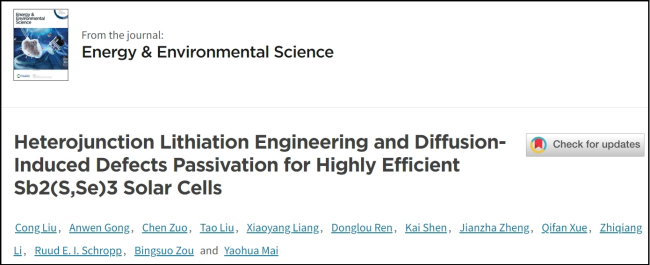 Recently, Professor Zou Bingsuo from GXU School of Resources, Environment and Materials has led his team to make further/significant progress in the research field of Selenium-Sulfur-Antimony solar cells. The relevant research findings, titled "Heterojunction Lithiation Engineering and Diffusion-Induced Defects Passivation for Highly Efficient Sb₂(S,Se)₃ Solar Cells" has been published in the top journal of the energy field, Energy & Environmental Science (Impact Factor: 32.4). This is the first research paper published in this journal, with Liu Cong, a PhD student from the School of Resources, Environment and Materials as the first author and corresponding author. Professor Zou Bingsuo and Professor Liu Tao from Guangxi University, as well as Professor Mai Yaohua from Jinan University are co-corresponding authors, and Guangxi University is the first to complete its unit. This study is sponsored by the National Natural Science Foundation of China, Guangxi Natural Science Foundation and Guangxi Bagui Scholars Program.