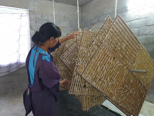 那坡县一名村民在观察桑蚕的生长情况。新华社记者黄浩铭 摄