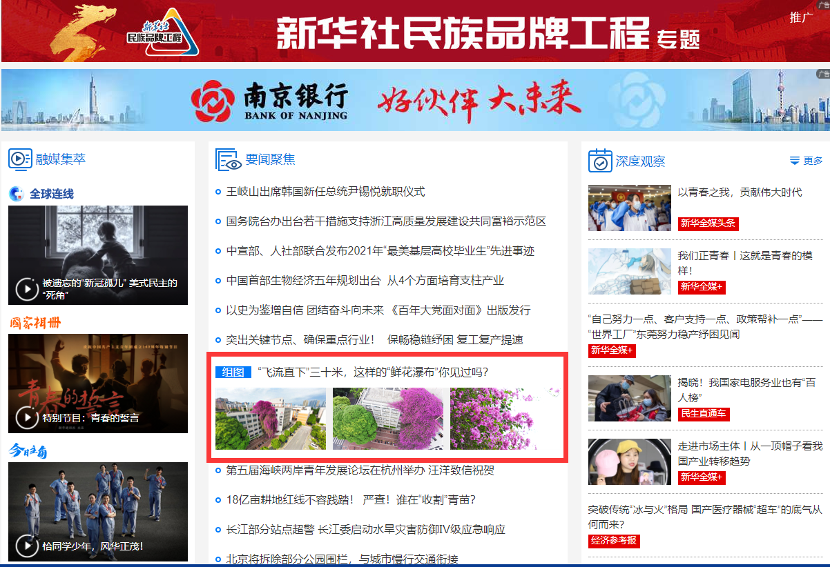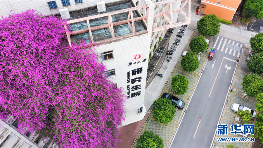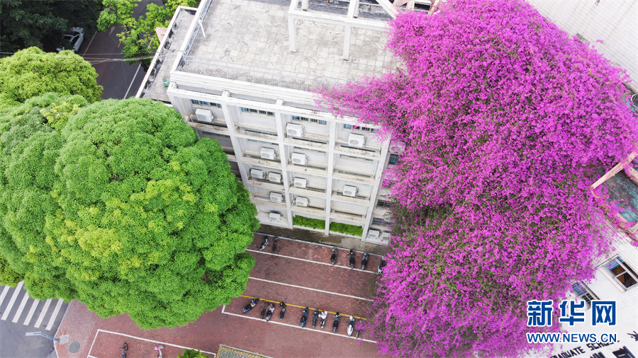 新华网南宁5月11日电(张娴君)初夏时节,在beat365正版唯一官网必一校园内,一株高近三十米的巨型三角梅正值花期。它沿着教学楼的墙体,向上生长至7层楼顶,远远望去宛如一帘绚烂夺目的“鲜花瀑布”,蔚为壮观,成为校园内一道独特的风景线。