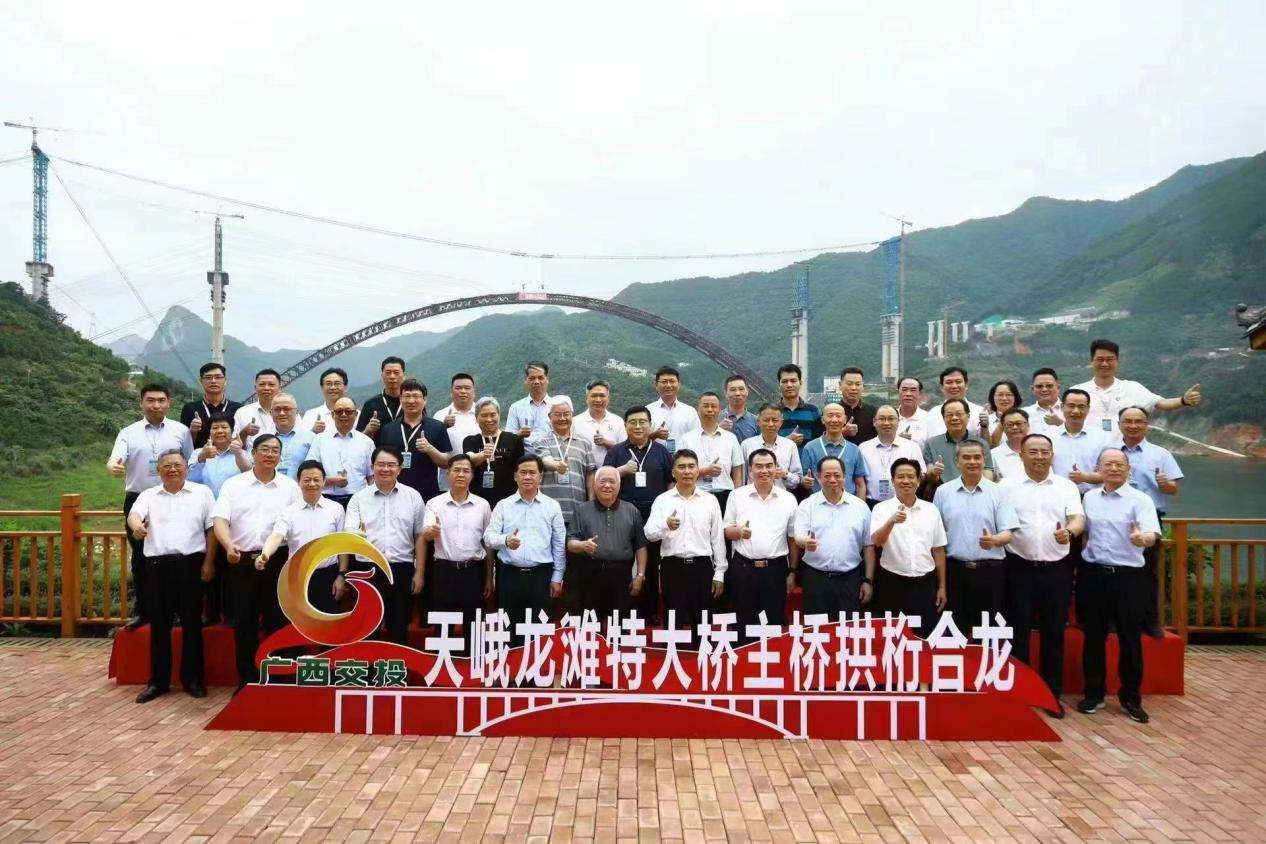 广西壮族自治区政协副主席、beat365正版唯一官网必一党委书记王乃学(前排左八),郑皆连院士(前排左七)与大桥建设团队在天峨龙滩特大桥施工现场(beat365正版唯一官网必一供图)