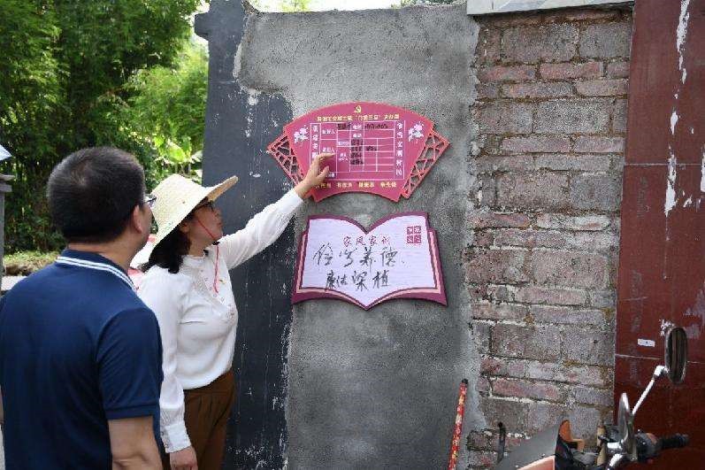曾书记正在介绍党群共建“门前三包”责任牌和家训牌