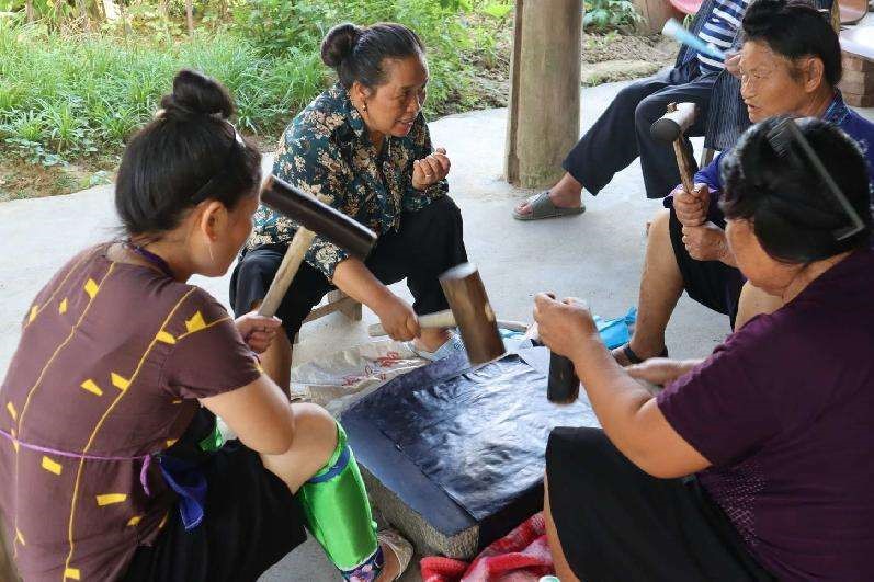 村民们正在制作亮布。赵云梓 秦磊 覃方平 摄
