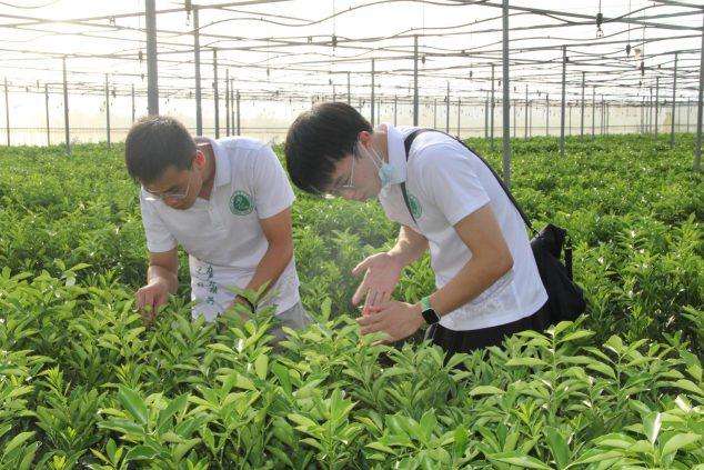 博士团实践队成员在查看金桔苗圃。陆宇诗摄