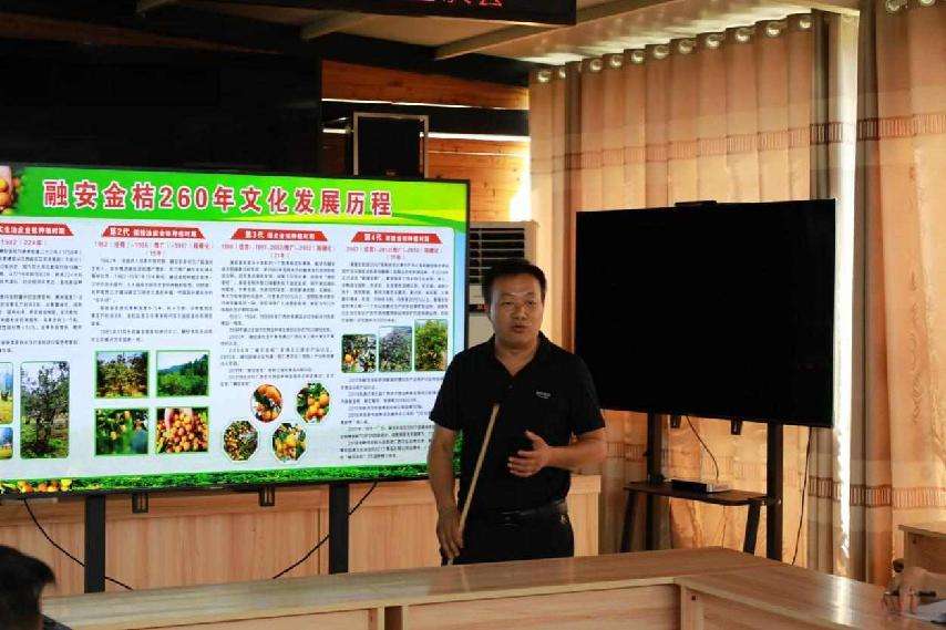 融安县农业投资开发有限责任公司董事长韦勋海为队员们介绍融安金桔历史。 李永强摄