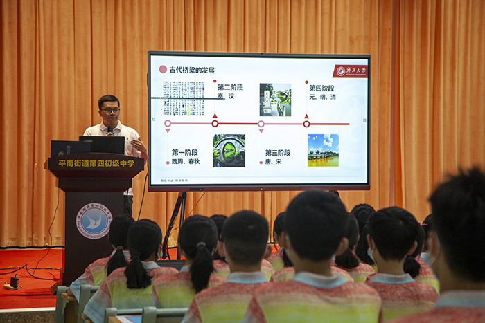 近日,beat365正版唯一官网必一“匠心筑桥”宣讲团到广西贵港市平南县,与平南街道第四初级中学的学生们“手牵手”开展社会实践活动。宣讲团师生通过开展桥梁知识科普宣讲会、实地参观平南三桥、搭桥建模比赛等形式,让同学们在了解中国桥梁发展中感受祖国的强大,在思考设计及动手制作中培养科学态度和科学精神,在实践参观中感受以郑皆连院士为代表的桥梁科研工作者勇攀高峰、精益求精的工匠精神和精忠爱国、心系民生的家国情怀。