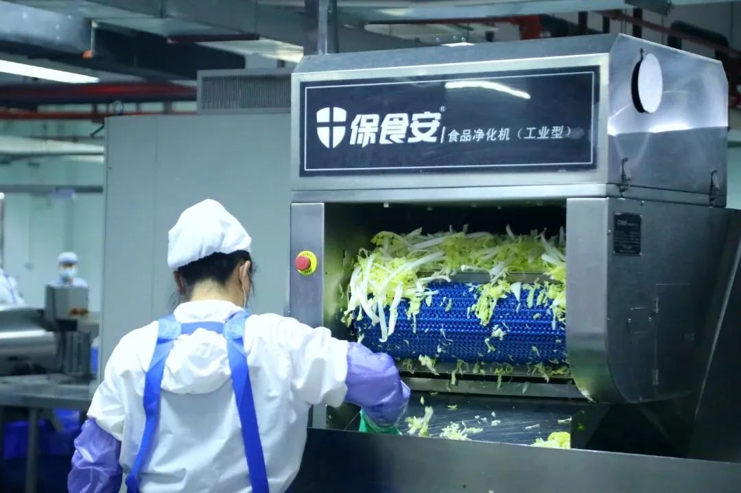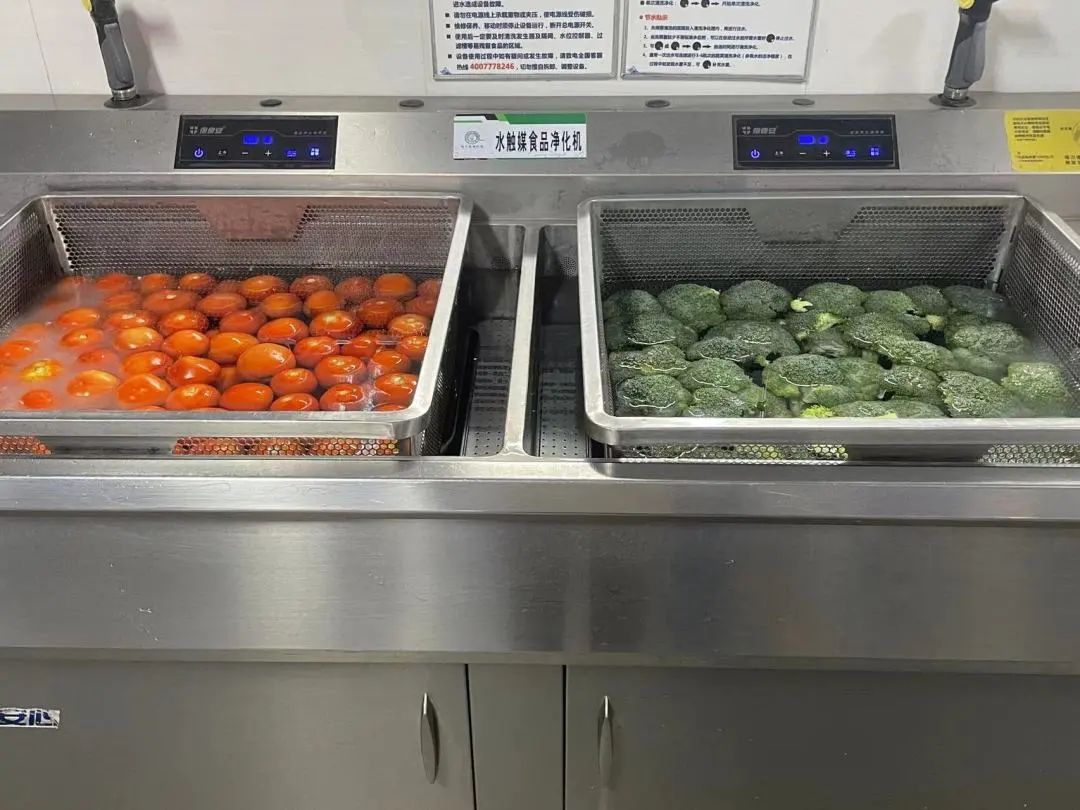 为保证果蔬的干净安全,食堂采用自动化清洗和水触媒净化设备。