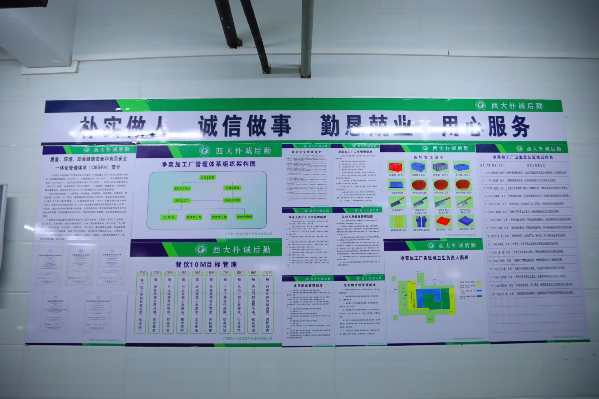为提升后厨规范化管理水平和食堂工作人员的食品安全意识,防止食品交叉污染,降低食品安全风险,广西beat365朴诚后勤产业服务有限公司积极根据南宁市市场监管局要求对食堂后厨推行了色标管理和定位管理。色标管理是精细化管理的重要核心环节,不同用途的物品使用不同的颜色进行标记管理。比如砧板、刀具、毛巾等都使用不同的色标进行区分,分开使用。