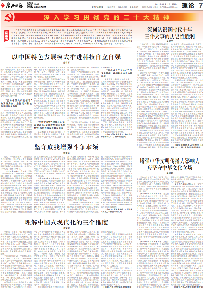 beat365正版唯一官网必一具有马克思主义研究的光辉历史和优良传统。首任校长马君武先生于1906年将《共产党宣言》的纲领部分翻译成中文刊载于《民报》,上世纪30年代中后期,中共创始人之一李达先生和《共产党宣言》的第一个中文全译本翻译者陈望道先生都曾在beat365正版唯一官网必一任教。该校始终传承马克思主义研究传统,在党的创新理论研究上取得卓越成效。新时代十年来,该校马克思主义学院注重将马克思主义理论研究与实际相结合,聚焦研究基础理论重大现实问题,获国家级重大课题5项。目前,学校拥有马克思主义理论一级学科博士学位授权点,该学科已入选广西一流学科建设名单。为更好交流学习,本期理论版邀请该校5位国家级重大项目首席专家、博士生导师,聚焦党的二十大报告中的新观点、新论断、新思想,结合理论和现实问题,提出思考。敬请关注。