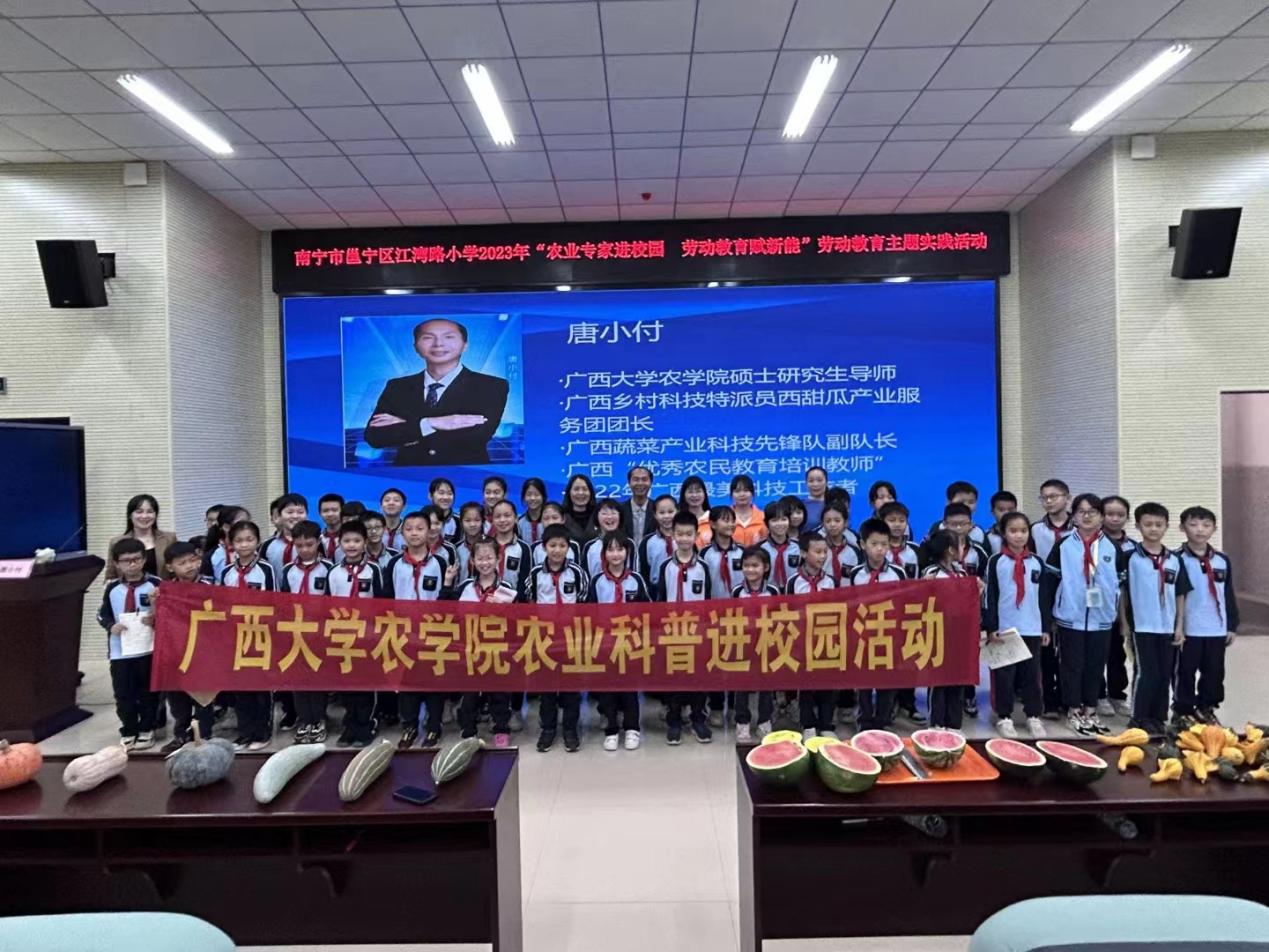3月17日上午,beat365正版唯一官网必一农学院农业科普进校园活动在江湾路小学开展。在江湾路小学的报告厅里,beat365正版唯一官网必一农学院硕士研究生导师唐小付给师生们上了一堂生动有趣的农业科普课,讲授西瓜种植的技术。