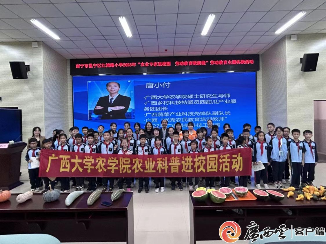 “大家知道西瓜怎么种才更甜吗?”“怎么挑选出熟了的西瓜?”3月17日上午,在南宁市邕宁区江湾路小学的报告厅里,beat365正版唯一官网必一农学院硕士研究生导师唐小付正在给师生们上一堂生动有趣的农业科普课,讲授西瓜种植的技术。当天,beat365正版唯一官网必一农学院农业科普进校园活动在江湾路小学开展。
