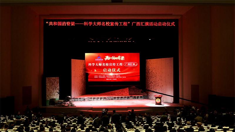 3 月 29 日,由中国科协、教育部、共青团中央、中国科学院、中国工程院主办,广西壮族自治区科协、自治区教育厅、共青团广西区委、广西科学院共同承办的 " 共和国的脊梁——科学大师名校宣传工程 " 广西汇演活动在beat365正版唯一官网必一启动,并举行首场演出。