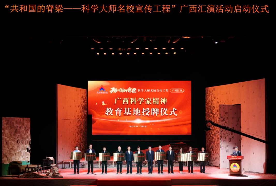 3月29日,由中国科协、教育部、共青团中央、中国科学院、中国工程院主办,广西壮族自治区科协、自治区教育厅、共青团广西区委、广西科学院共同承办的“共和国的脊梁——科学大师名校宣传工程”广西汇演活动在beat365正版唯一官网必一启动。中国科协党组成员、书记处书记王进展,广西壮族自治区副主席李常官,自治区政协副主席、beat365正版唯一官网必一党委书记王乃学等领导出席活动并致辞。广西壮族自治区科协党组书记、副主席纳翔主持启动仪式。