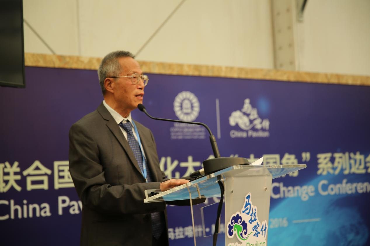 图1 郑保卫主任在2016年马拉喀什联合国气候大会气候传播边会上致辞