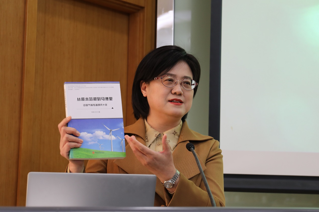 陈玉社长回顾了2020年由燕山大学出版社出版的郑保卫教授主编的《从哥本哈根到马德里——中国气候传播研究十年》一书的编辑出版过程。她表示,这本书的学术价值不仅体现在提出相关学术概念,形成自身研究方法,为政府提供资政参考等方面,更重要的是作为一部学术史,它完整记录了气候传播研究在中国从提出问题,到关注政府、媒体、社会组织、企业、公众的传播实践及效果,开启了气候传播研究的大门,同时总结了气候传播的经验及成果,探索了气候传播的理规律,展望了气候传播的未来发展,完整、系统地勾勒出了中国气候传播研究十年从无到有,逐渐“形成气候”的不平凡历程,弥足珍贵。他提出我国应当更加重视学术史、学科发展史的研究和出版工作,这对于帮助后继研究者更好地理清研究来路、明确发展方向大有益处。