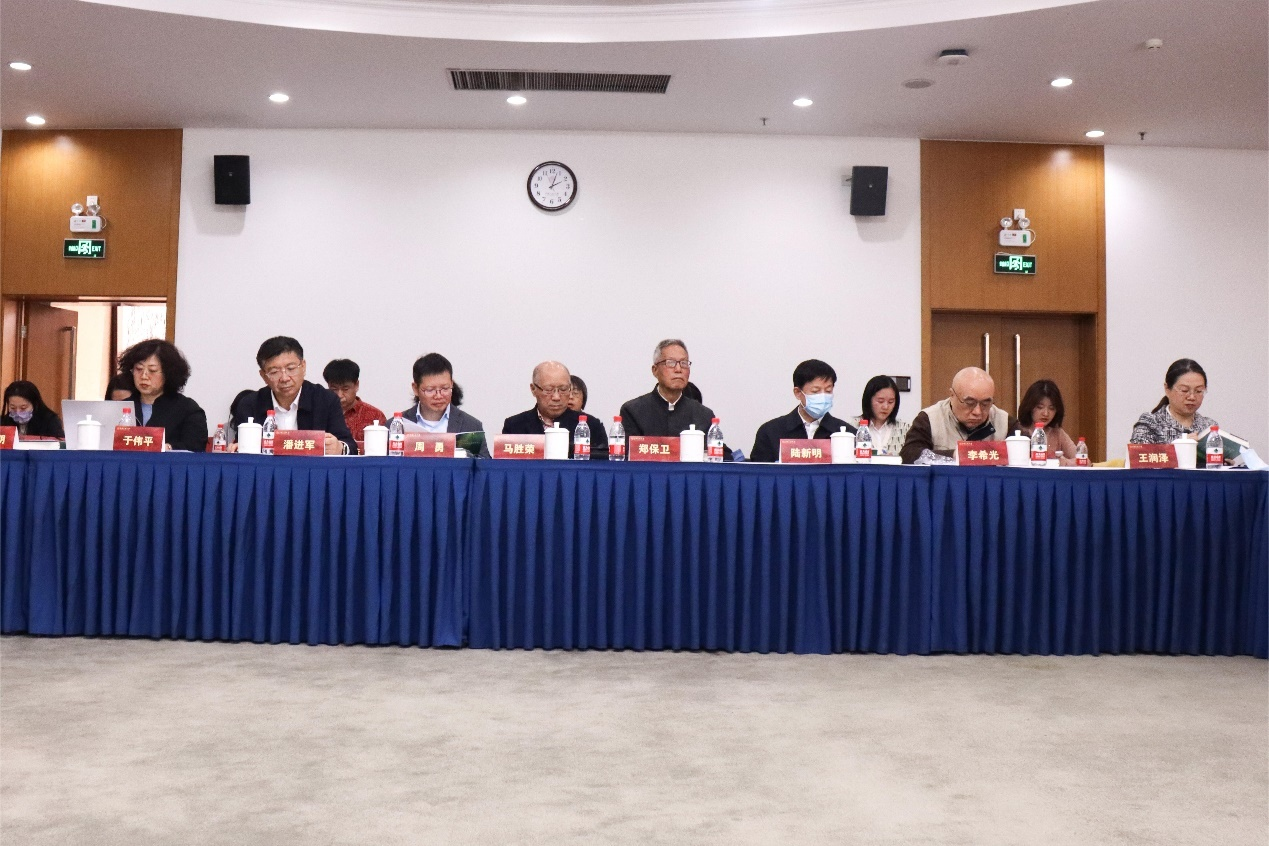 (图为出席会议的领导和嘉宾。自左至右:于伟平、潘进军、周勇、马胜荣、郑保卫、陆新明、李希光、王润泽)