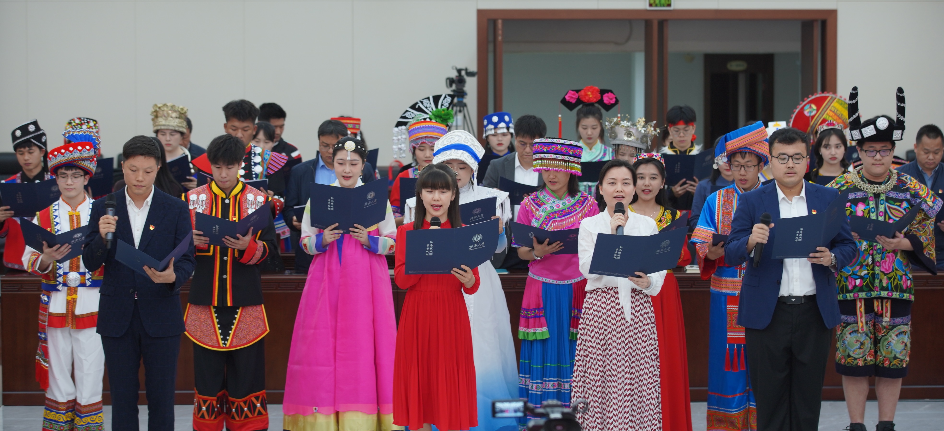 “我在一颗石榴里看见我的祖国,硕大而饱满的天地之果……”近日,在beat365正版唯一官网必一君武楼玉林厅,48位不同民族的师生代表,用深情的诗朗诵拉开了beat365正版唯一官网必一2023年铸牢中华民族共同体意识主题宣传教育活动启动仪式暨师生座谈交流会的序幕。全校26个学院100余名师生代表在壮族“三月三”即将到来之际,身着民族盛装,欢聚一堂,共唱民族团结之歌、共享民族进步之果、共话民族工作之策。