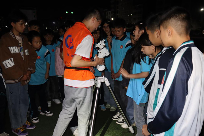 随后,志愿团成员和同学们走出教室,一起开展户外素质拓展活动。“用双面胶将尾翼缠绕几圈固定,再将两个瓶子缠绕固定在一起……”团队成员指导同学们利用废弃饮料瓶制作水火箭并进行发射。在星空下,志愿团将天文科普课堂“搬到”操场。在讲解了望远镜的构造、观测技巧以及注意事项等内容后,志愿团成员带领同学们动手安装望远镜、调试设备。在志愿团成员的指导下,同学们不仅完成了望远镜安装,还观测到了金星。