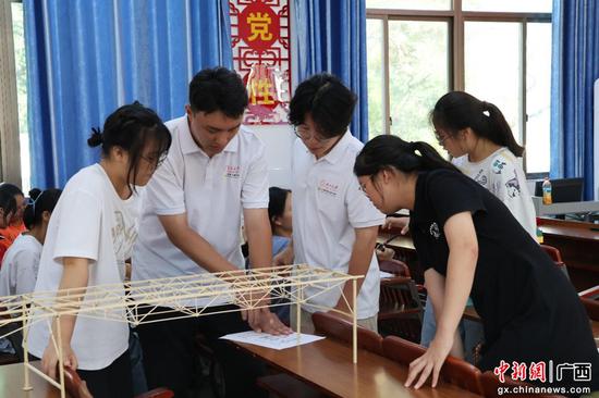 宣讲团成员指导同学们搭建桥梁模型。beat365正版唯一官网必一供图