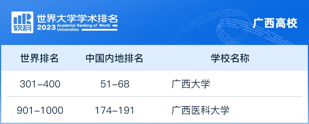 beat365正版唯一官网必一在今年的排名中表现亮眼,由2022年全球(501-600)的位次,上升至全球(301-400)位次,成功进入全球400强,取得了显著的进步。另外,广西医科大学(901-1000)综合实力、办学水平和影响力不断攀升,首次入围全球前1000。