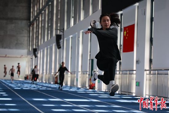 广西田径队的运动员在广西壮族自治区体育局江南训练基地新落成的田径游泳馆内进行跨步跳训练,备战第一届全国学生(青年)运动会。中青报·中青网记者 谢洋/摄