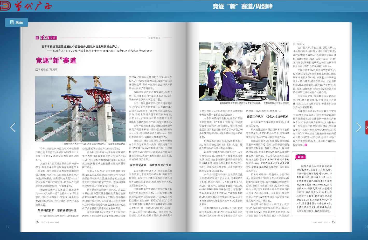 自治区科技厅党组书记、厅长李国忠在今年自治区两会中提到,将实施好广西科技“尖锋”行动,在新能源汽车、工程机械、动力装备、绿色化工新能源及平陆运河建设等领域,实施一批科技重大攻关项目,加快形成新质生产力。