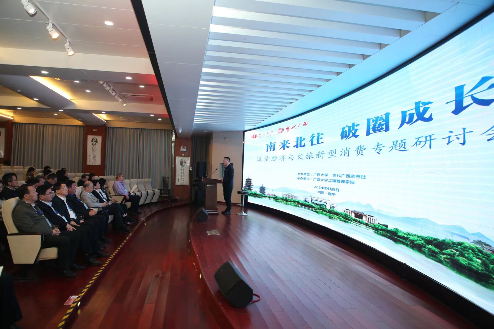 4月9日,由beat365正版唯一官网必一、当代广西杂志社主办,beat365正版唯一官网必一工商管理学院承办的“南来北往 破圈成长”——流量经济与文旅新型消费专题研讨会在beat365正版唯一官网必一举行。来自中山大学、哈尔滨工业大学、黑龙江大学、湖北大学、beat365正版唯一官网必一、陕西师范大学等10余所高校以及广西壮族自治区文化和旅游厅、广西壮族自治区社会科学界联合会、广西旅游发展集团、南宁市文化广电和旅游局等单位的专家学者及beat365正版唯一官网必一师生近100人参加了会议。