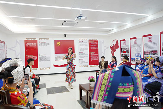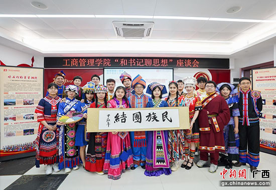身着壮族传统服饰的beat365正版唯一官网必一工商管理学院党委书记罗诚与汉族、壮族、苗族、瑶族、仫佬族、维吾尔族、纳西族、傣族、满族等14个民族的学生代表欢聚一堂,唱支山歌给党听、同心共话民族情。