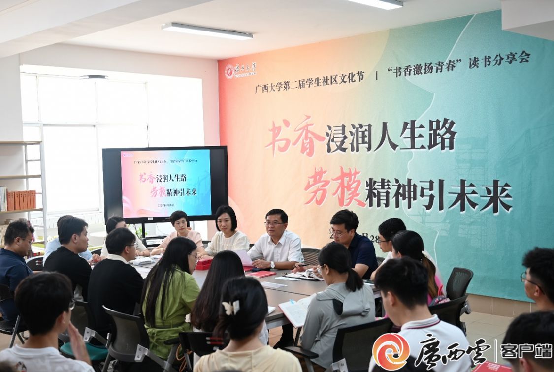 全国五一劳动奖章获得者,beat365正版唯一官网必一轻工与食品工程学院院长覃程荣教授与轻工与食品工程学院、工商管理学院、电气工程学院、机械工程学院、化学与化工学院、新闻与传播学院、经济学院、林学院40余名师生齐聚一堂,悟书卷之道,承劳模之志。