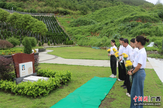 师生们集体肃立,默哀并三鞠躬,依次敬献鲜花,缓步绕墓一周,表达对黄文秀的崇高敬意和深切怀念。