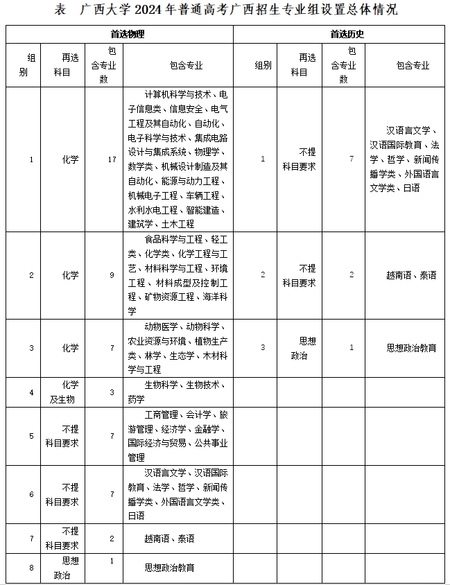 根据广西壮族自治区招生考试院招生计划及志愿填报设置办法,依据“吸引高分、减少调剂、确保生源”的原则,beat3652024年本科招生专业组总体设置方案如下:67个招生专业中,特殊类型招生(艺术、体育类)按自治区招生考试院要求单独设置院校专业组;普通类招生以首选科目不同,分别设置历史、物理两大院校专业组,然后根据再选科目、生源情况、学科类型等因素在同一首选科目下设多个招生专业组,其中首选科目为历史的专业设三个组,首选科目为物理的专业设八个组。