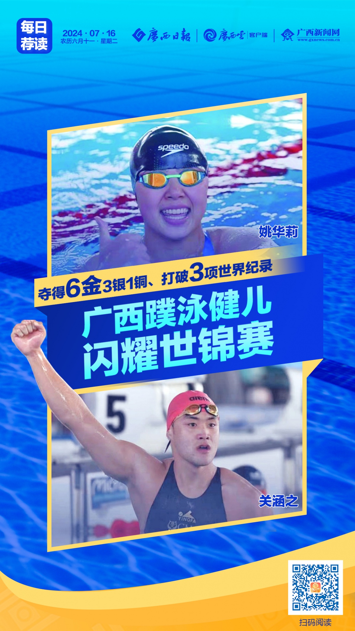 广西健儿还夺得男子200米器泳项目金牌。比赛中,关涵之在折返转身时意外发生肩关节脱臼,但他没有轻言放弃,最终游出了1分12秒86并率先“撞线”,意外打破了1分13秒58的原世界纪录,为中国队收获了一枚成色十足的金牌。