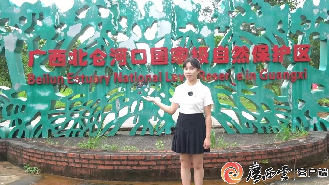 实践团粟爽同学在红树林保护区大门录制生态安全团课。阳柳蓉 摄