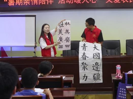 了解基本情况后,各实践团队前往当地学校和社区,面向小学生、社区群众、教师和基层工作人员等群体,有针对性地开展普通话培训活动和“典耀中华”读书活动。志愿者们通过普通话正音训练、绕口令、演讲与朗诵、书法公益课等内容丰富、形式多样的教学活动,开展普通话训练,增进当地不同群体民众对国家通用语言文字重要性的了解和认知,激发其学习热情。