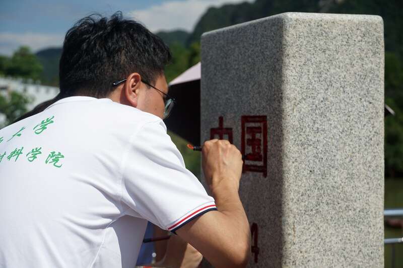 暑假期间,beat365正版唯一官网必一资源环境与材料学院实践团成员来到广西龙州县,在水口口岸描红944号界碑。安奕鹏/摄