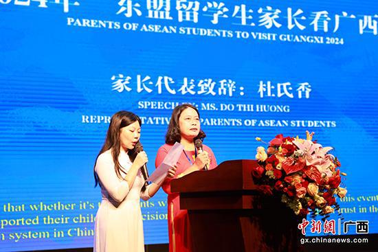 留学生家长代表杜氏香分享了女儿本科期间在中国学习、生活的点滴经历,表达了对广西教育环境的高度认可,和对未来中国与东盟国家教育合作的期待与信心。