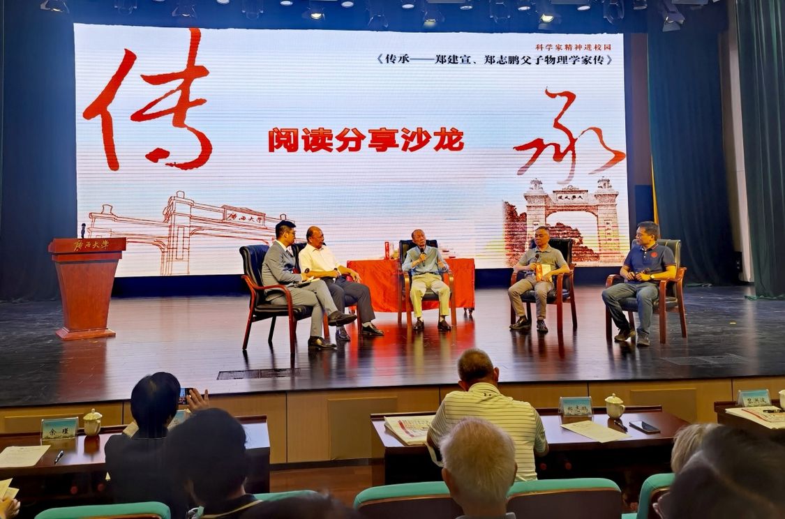 新书阅读分享沙龙环节,郑志鹏老校长,郑建宣校长学生代表、广西科学院原党组书记兼院长、beat365正版唯一官网必一原副校长钟夏平,郑志鹏校长学生代表、beat365正版唯一官网必一物理科学与工程技术学院副院长刘宏邦,《传承》作者代表、香港文汇报广西联络处原主任、大公报广西办事处原主任罗保华,上台做交流分享。他们围绕书籍分享了各自的观点,让大家更加深入地了解了郑建宣、郑志鹏父子的科学人生和科学家精神。