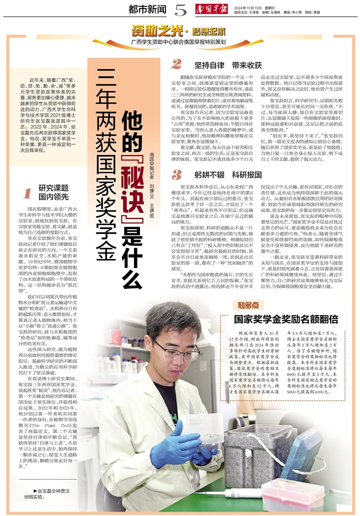 近年来,随着广西“奖、助、贷、免、勤、补、减”等多元学生资助政策体系的完善,服务更加暖心便捷,越来越多的学生从资助中获得前进的动力,beat365正版唯一官网必一生命科学与技术学院2021级博士研究生张宝磊就是其中一员。2022年、2024年,张宝磊先后两次获得国家奖学金。他说,奖学金不单是一种荣誉,更是一种肯定和一次自我审视。