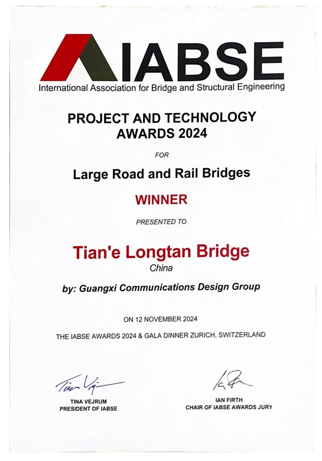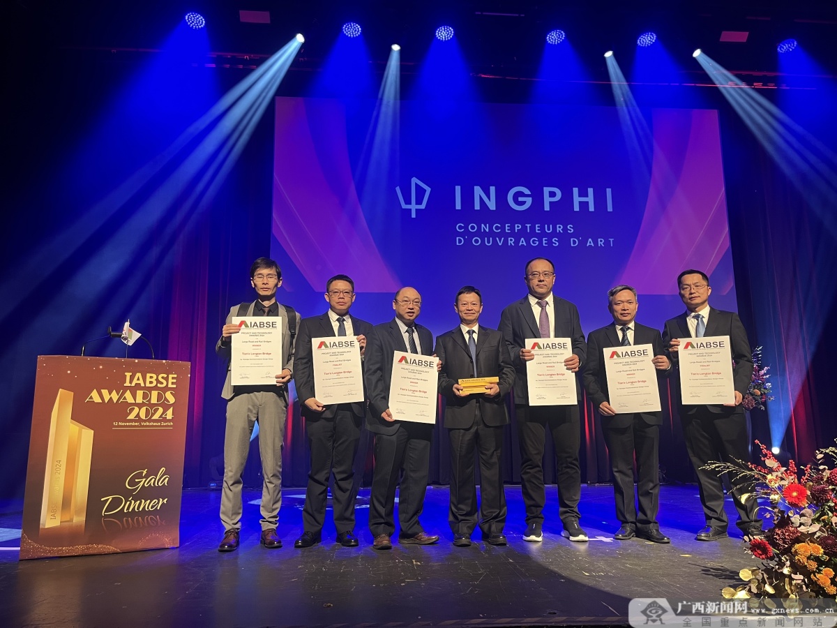 11月12日(当地时间),2024年国际桥梁与结构工程协会(简称IABSE)颁奖典礼在瑞士苏黎世Volkshaus隆重举行。全球38个工程入围,我国有13个工程上榜,其中,由广西交通投资集团投资、广西路桥工程集团承建的天峨龙滩特大桥荣获“大型公路与铁路桥最高奖”。