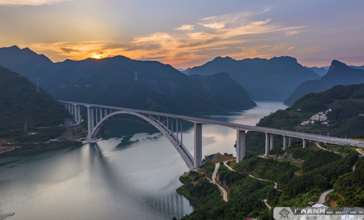 天峨龙滩特大桥横跨河池市天峨县龙滩水库,主桥为跨径600米的上承式劲性骨架混凝土拱桥,是目前世界最大跨度劲性骨架混凝土拱桥,引领世界拱桥正式迈入600米级时代,实现世界拱桥发展史上里程碑式的跨越。