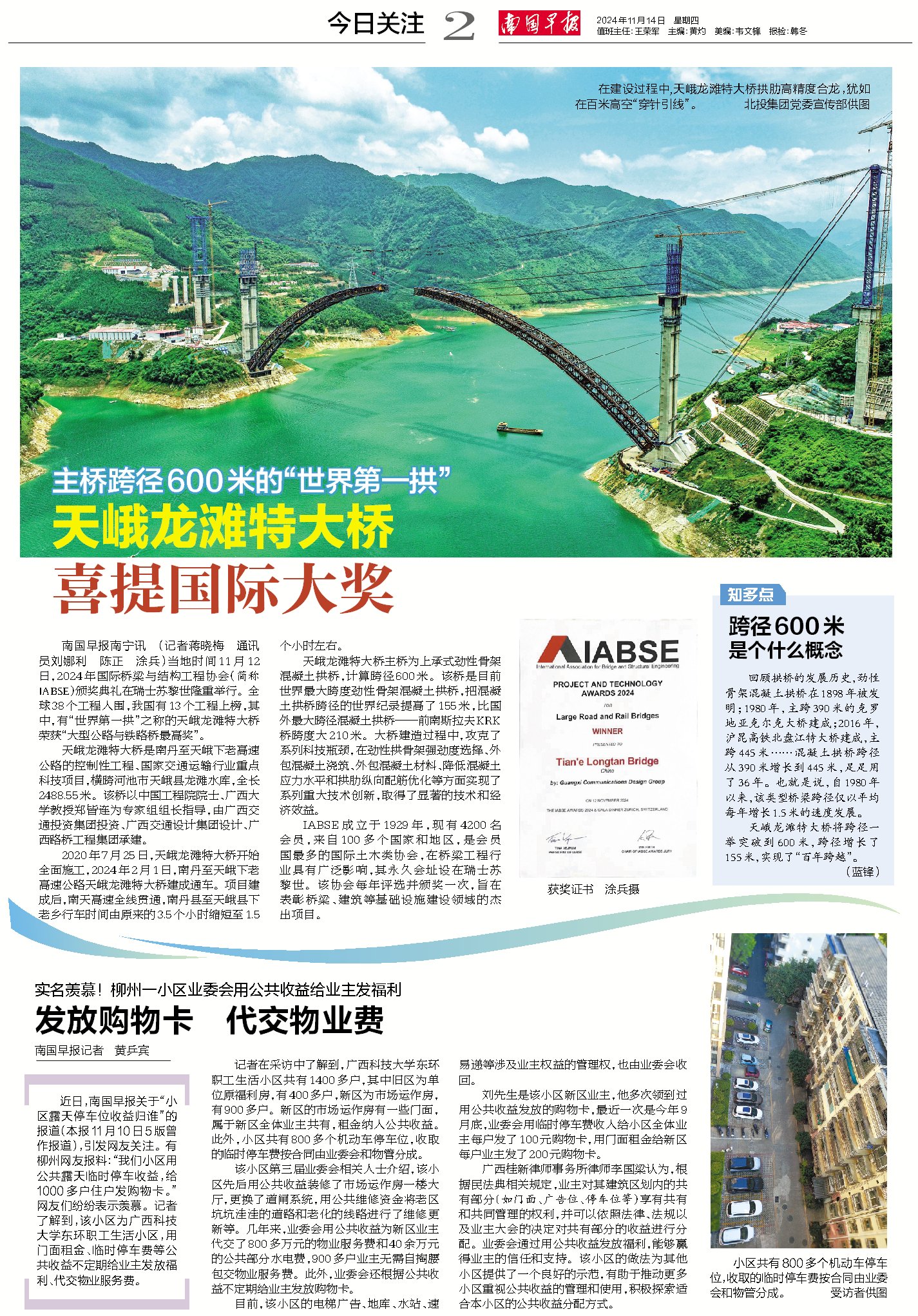 当地时间11月12日,2024年国际桥梁与结构工程协会(简称IABSE)颁奖典礼在瑞士苏黎世隆重举行。全球38个工程入围,我国有13个工程上榜,其中,有“世界第一拱”之称的天峨龙滩特大桥荣获“大型公路与铁路桥最高奖”。