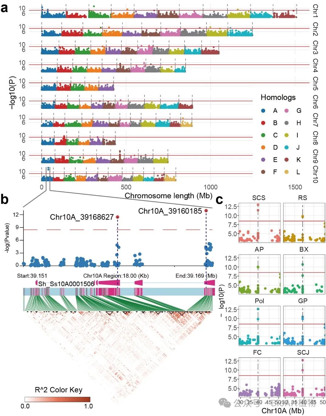 为揭示现代甘蔗高糖特征的遗传基础,研究团队收集了8个与糖分相关的性状,发现现代甘蔗品种中来自高贵种的成分占比越高,糖分性状越突出,纤维性状越低,说明高贵种对现代甘蔗高糖性状的突出贡献。此外,研究团队通过GWAS识别了多个与糖分性状相关的关键位点,其中2个SNPs位点与7个性状相关,位于10号染色体,编码NB-ARC蛋白基因。研究人员通过比较不同甘蔗种群在这些关键位点的单倍型,为理解甘蔗糖分性状的遗传基础和优化育种策略提供了全新的视角,为提升甘蔗的糖分产量和育种效率奠定了基础。