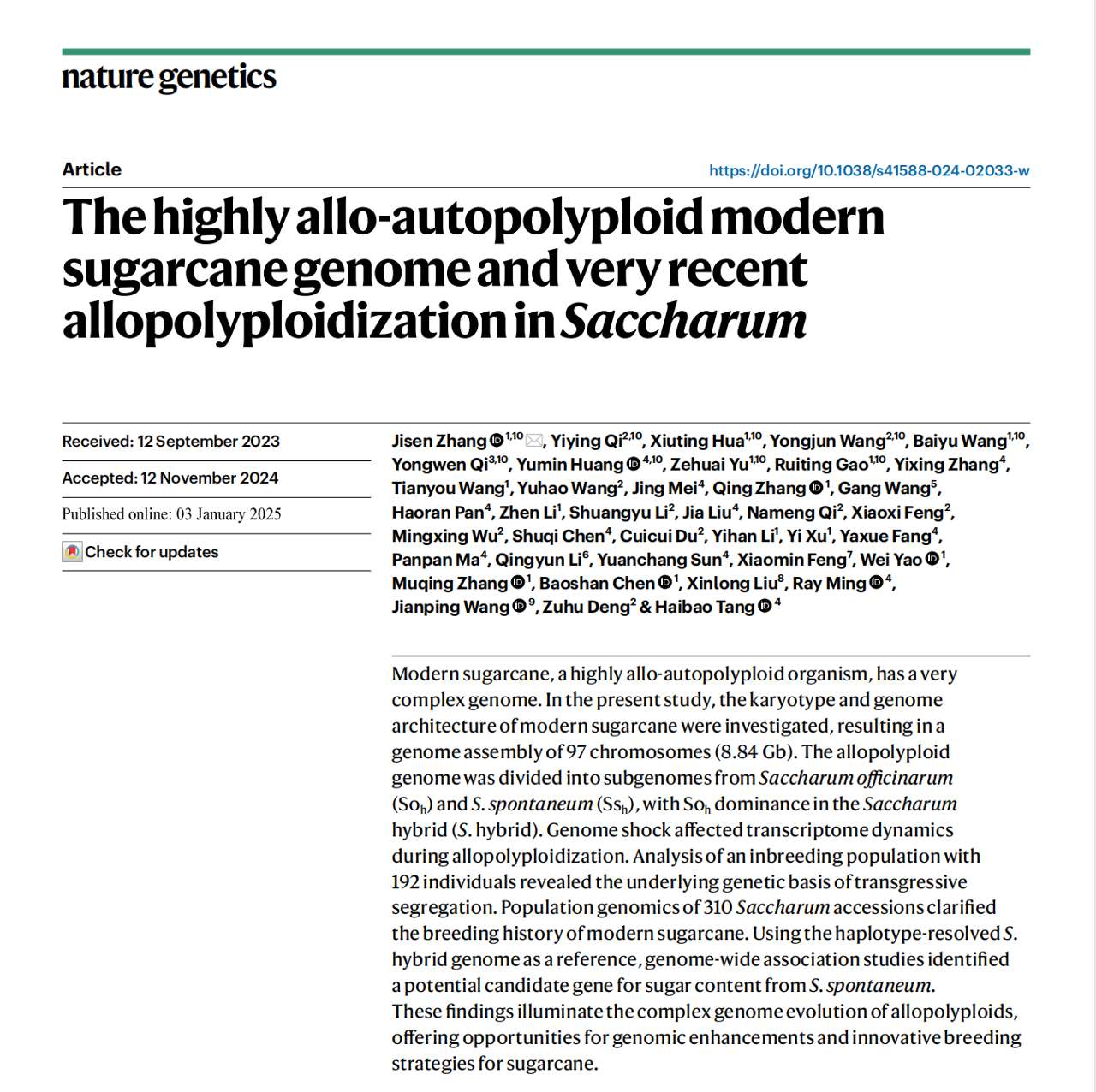 该成果的重要部分《现代栽培甘蔗的高倍体复杂基因组与近期异源多倍演化》已于1月3日在国际权威学术期刊《自然遗传学》(Nature Genetics)杂志发表。