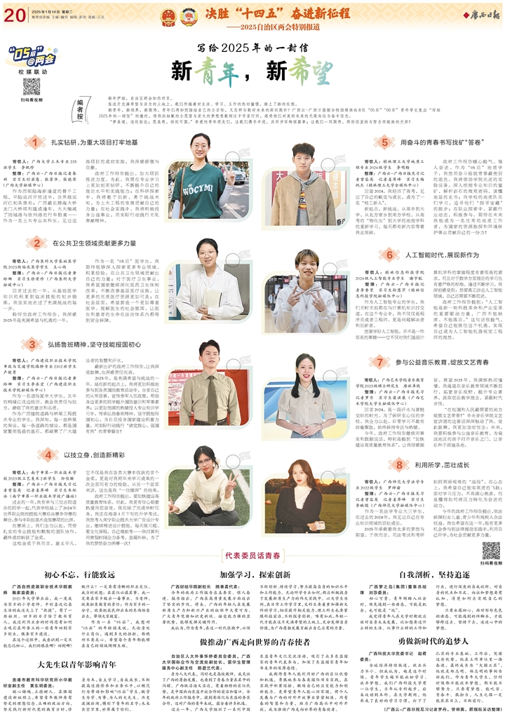今年的政府工作报告求真务实、催人奋进。报告指出,广西在高质量发展方面迈出了坚实的步伐。将来,广西的年轻人在发展新质生产力和新兴产业的征程中大有可为。广大青年凭借知识更新快、接受能力强的显著优势,能够发挥关键作用。