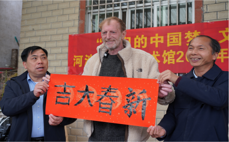 谢万举(左)、Nick(中)、唐小付(右)展示Nick写的横幅